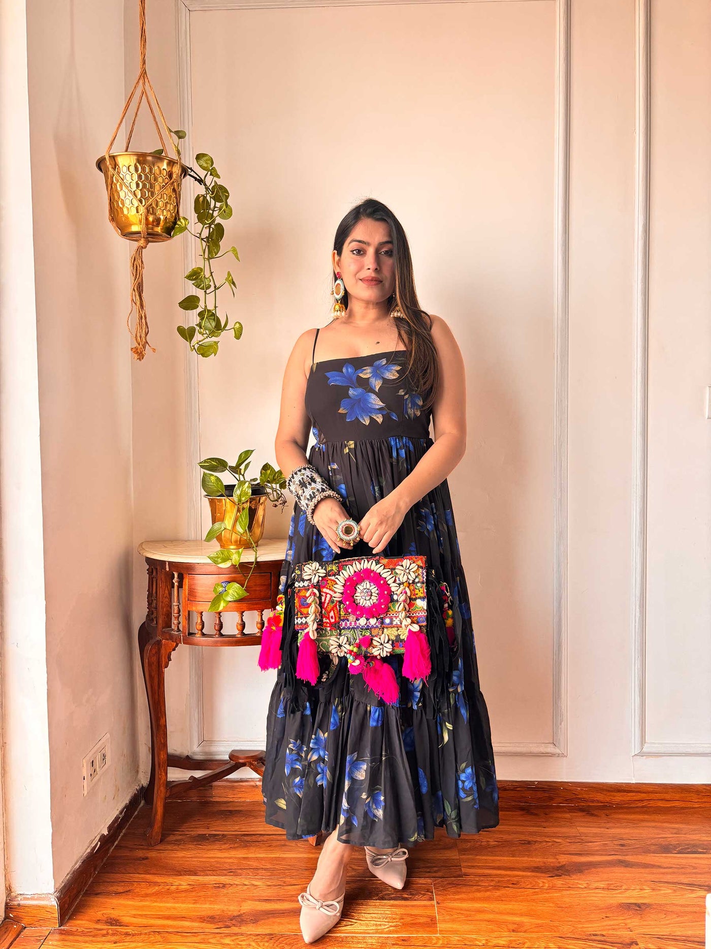 Crafted from soft and flowy Georgette, this layered full-flared dress is designed for everyday elegance. The strappy sleeve style adds a chic, modern touch, while the layered silhouette ensures graceful movement and comfort. With its lightweight fabric and versatile design, this dress is perfect for daily wear, casual outings, or relaxed gatherings, offering a blend of style and ease for any occasion.