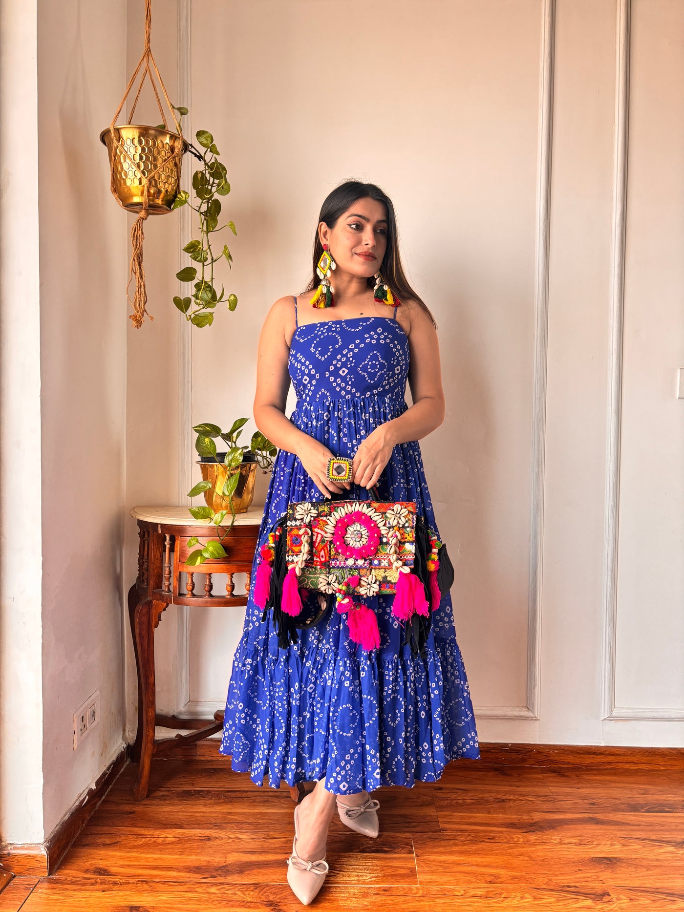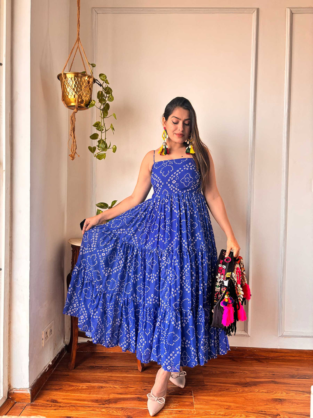 light,airy and Summer-ready-this blue Georgette maxi dress features bandhni prints and delicate thin straps for an effortlessly elegant look.